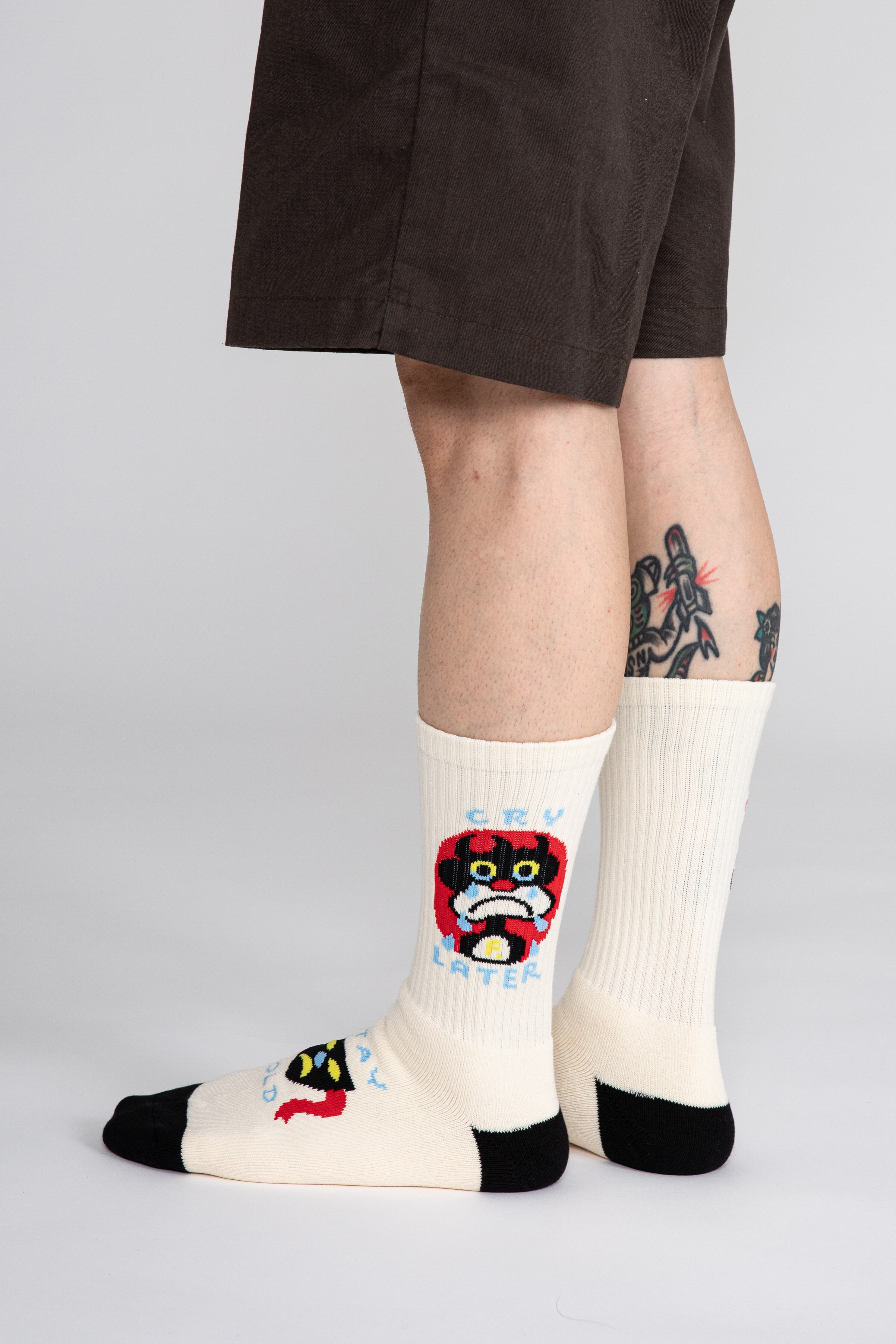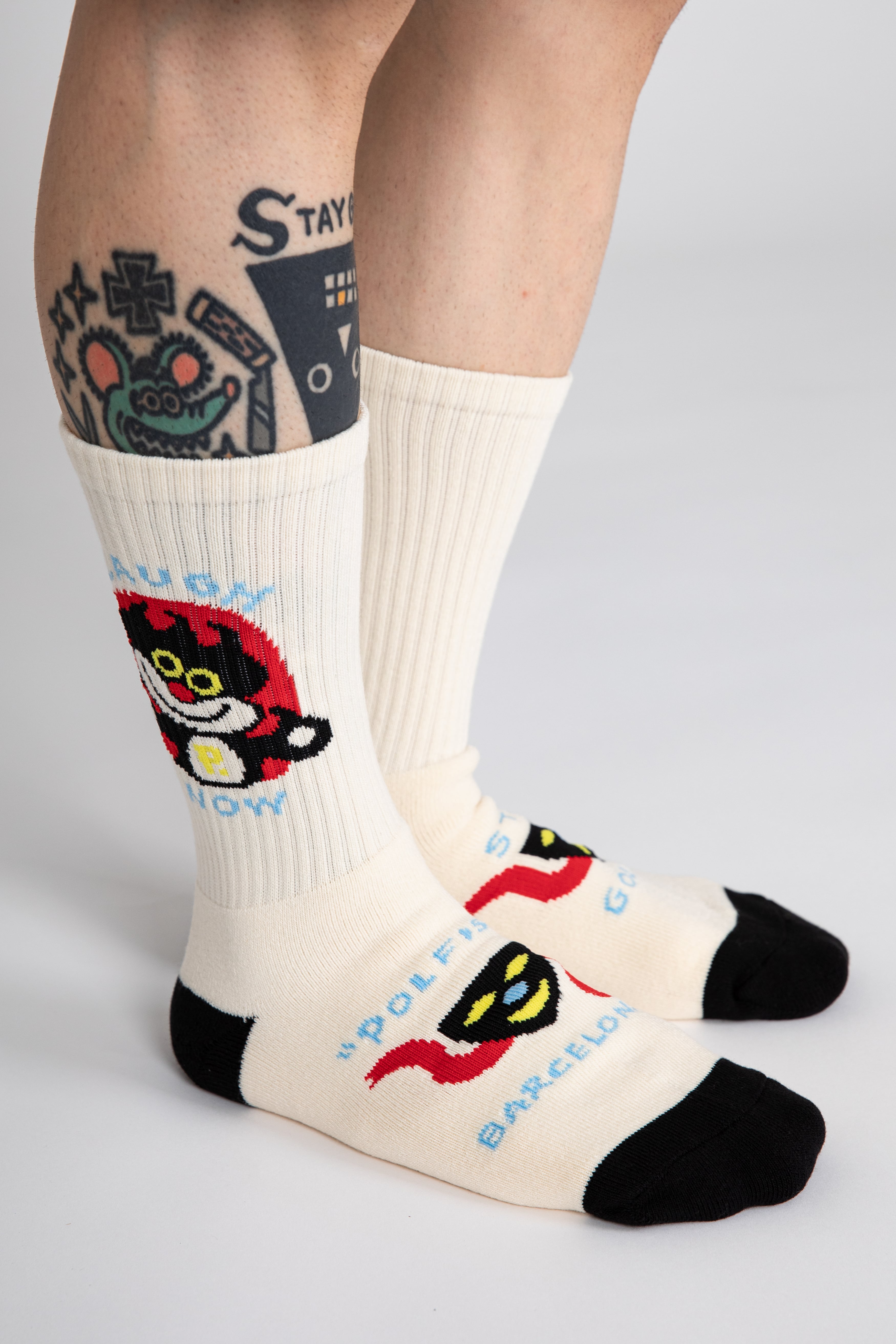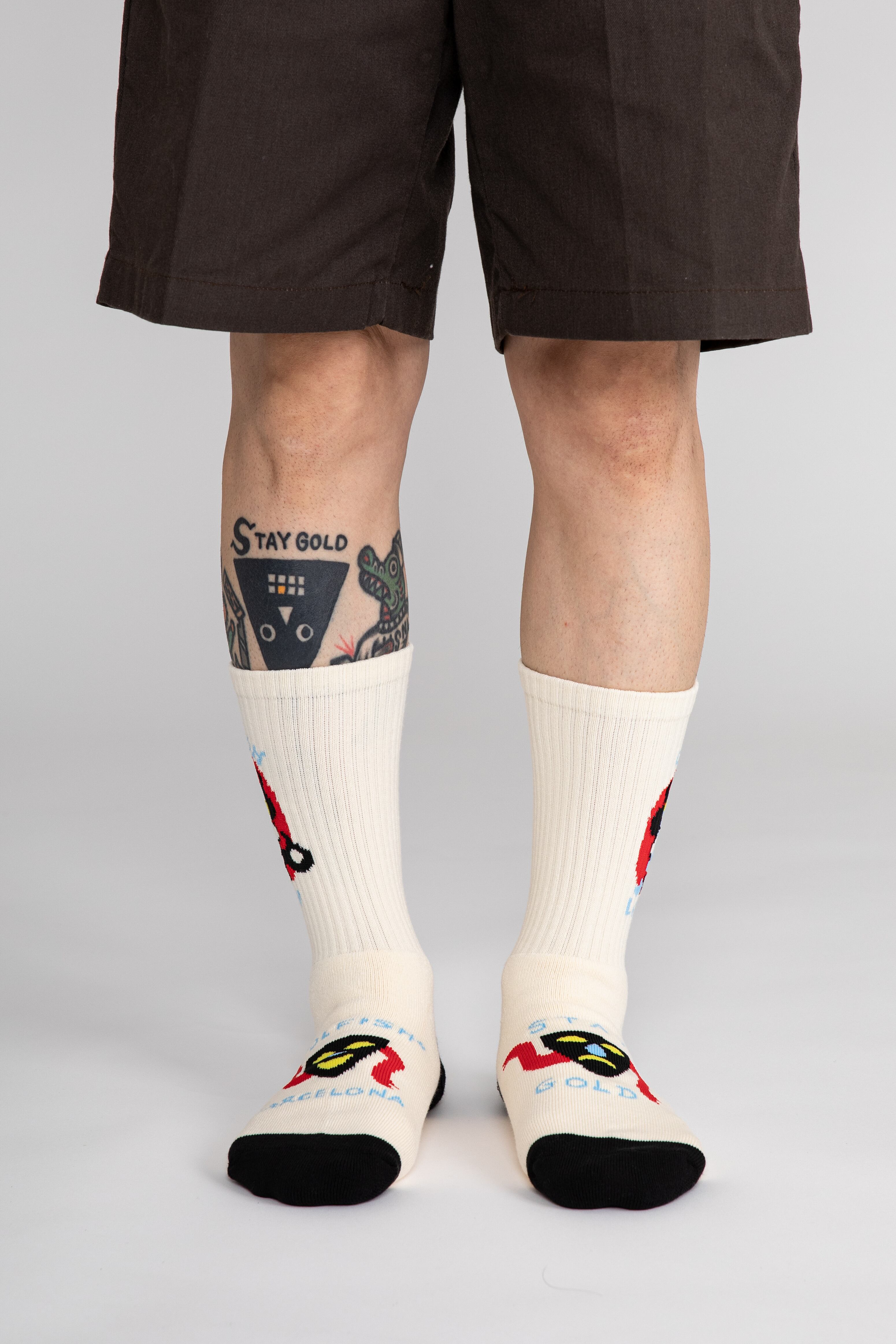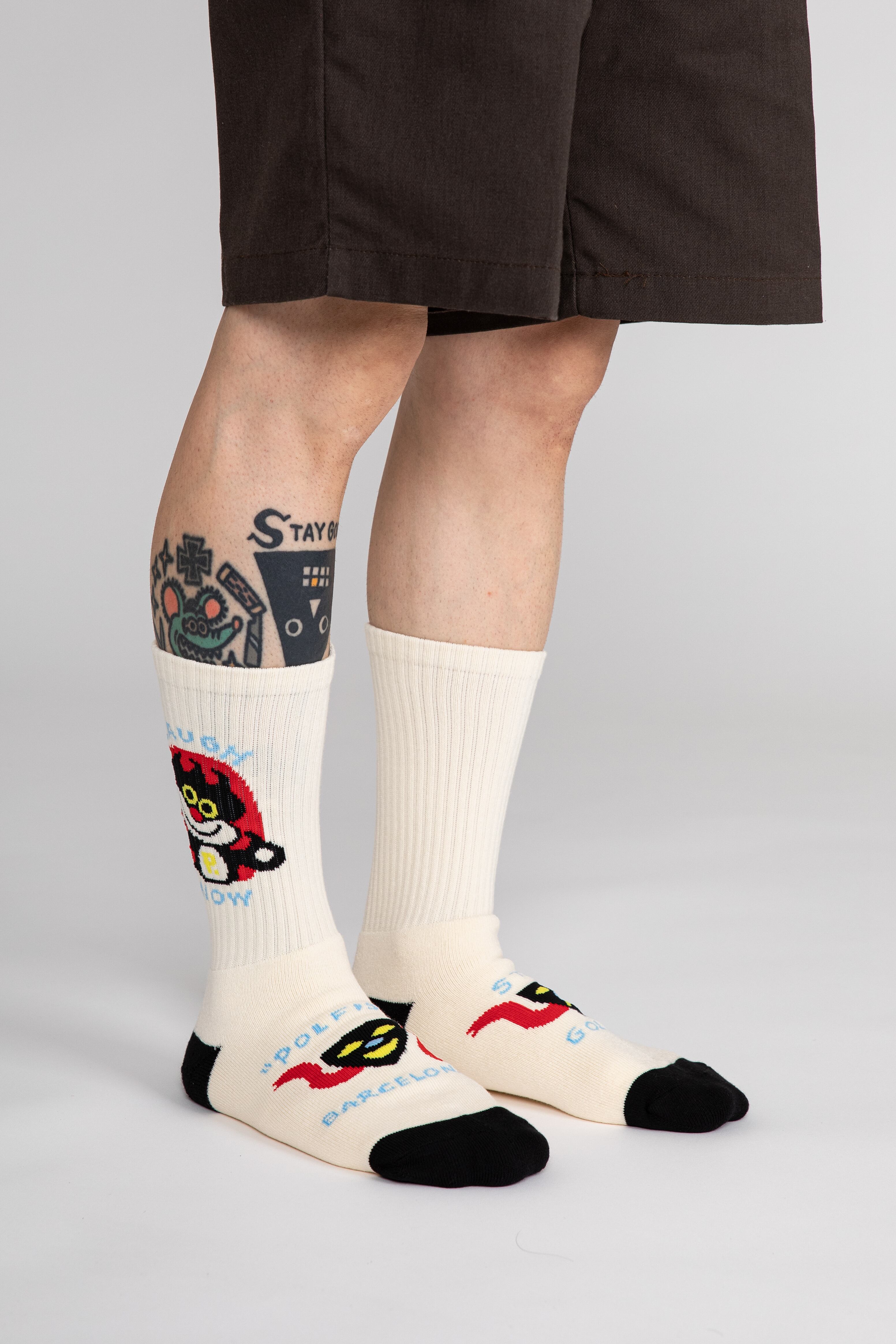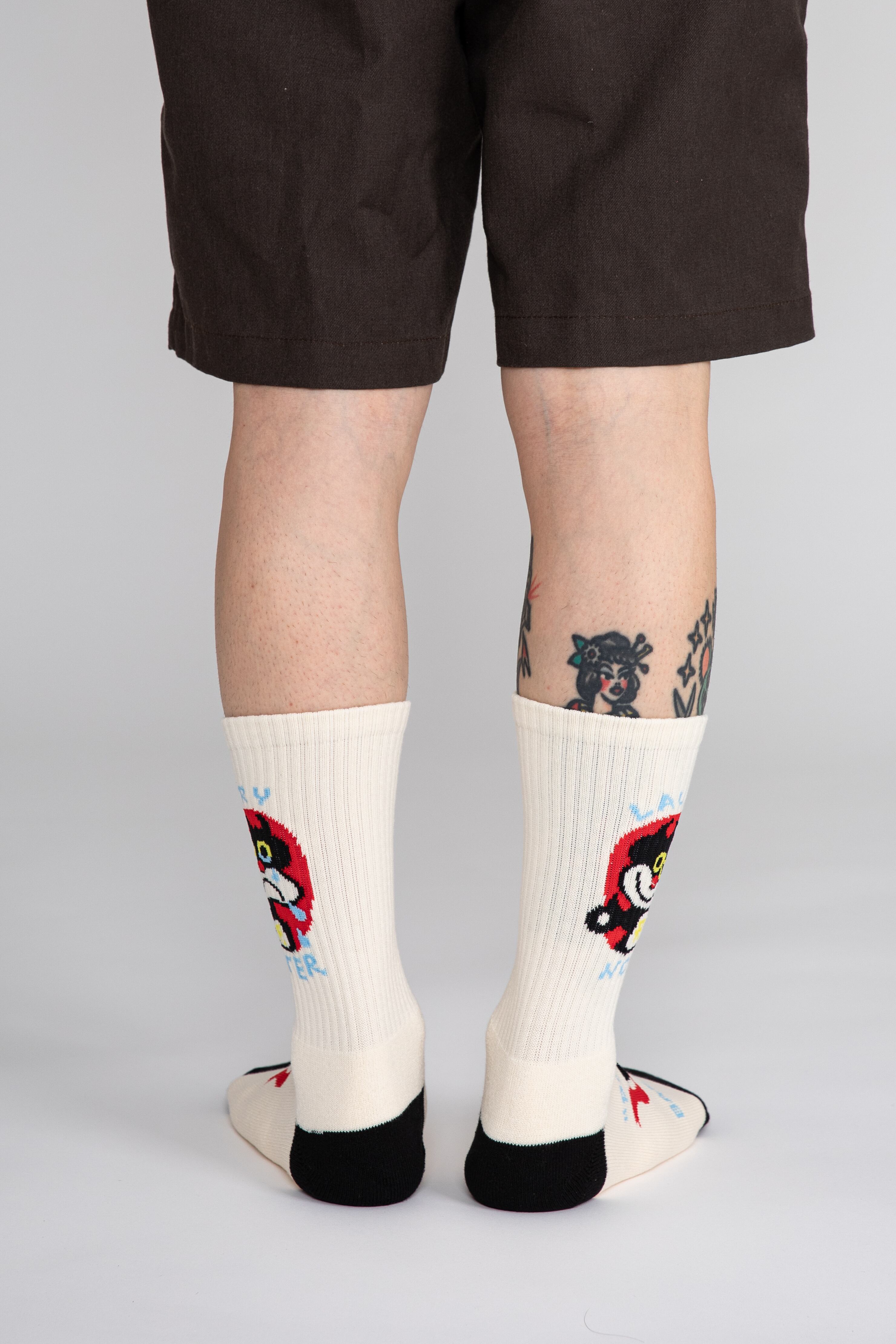 短すぎず長すぎないちょうど良い長さの靴下に彼のアートを詰め込みました。