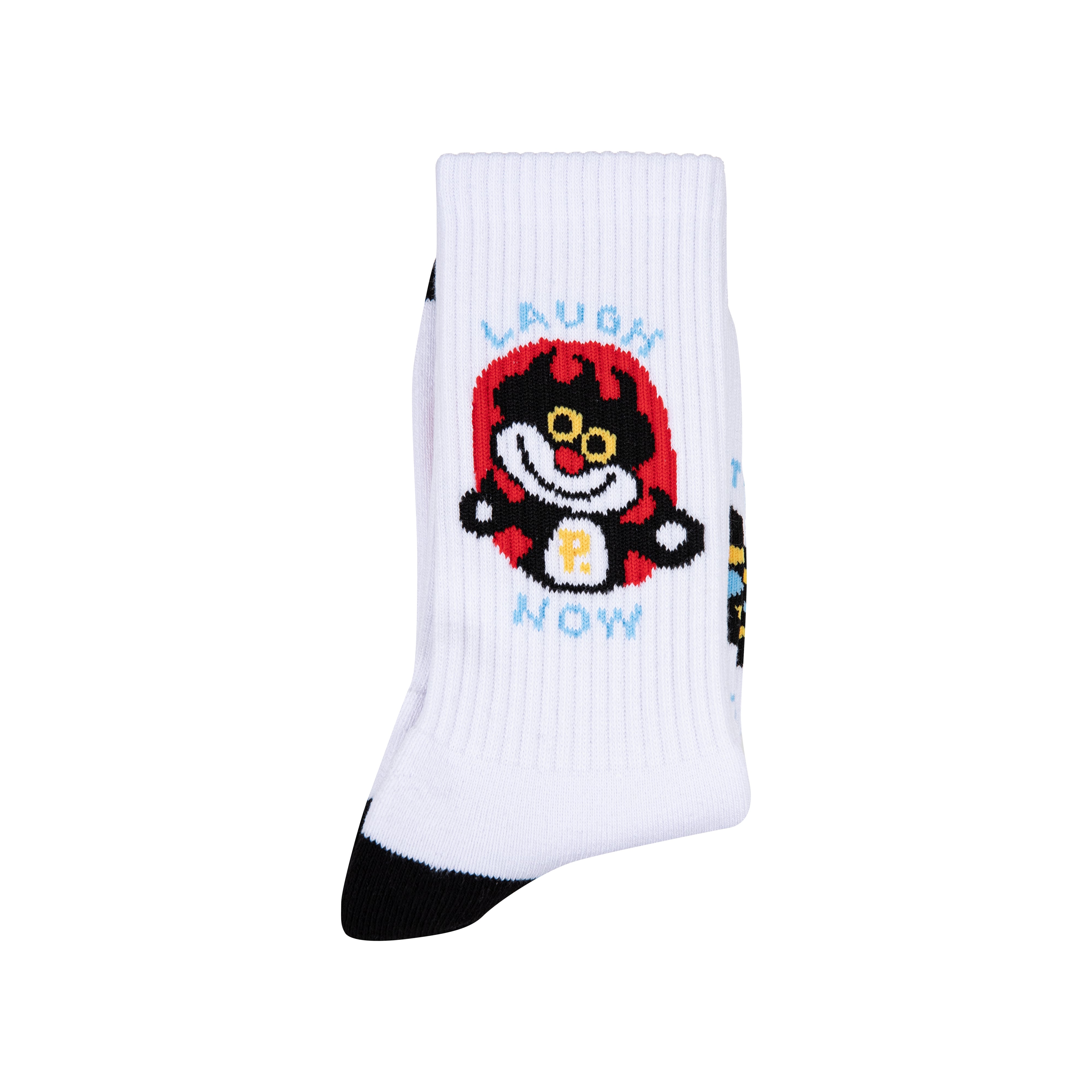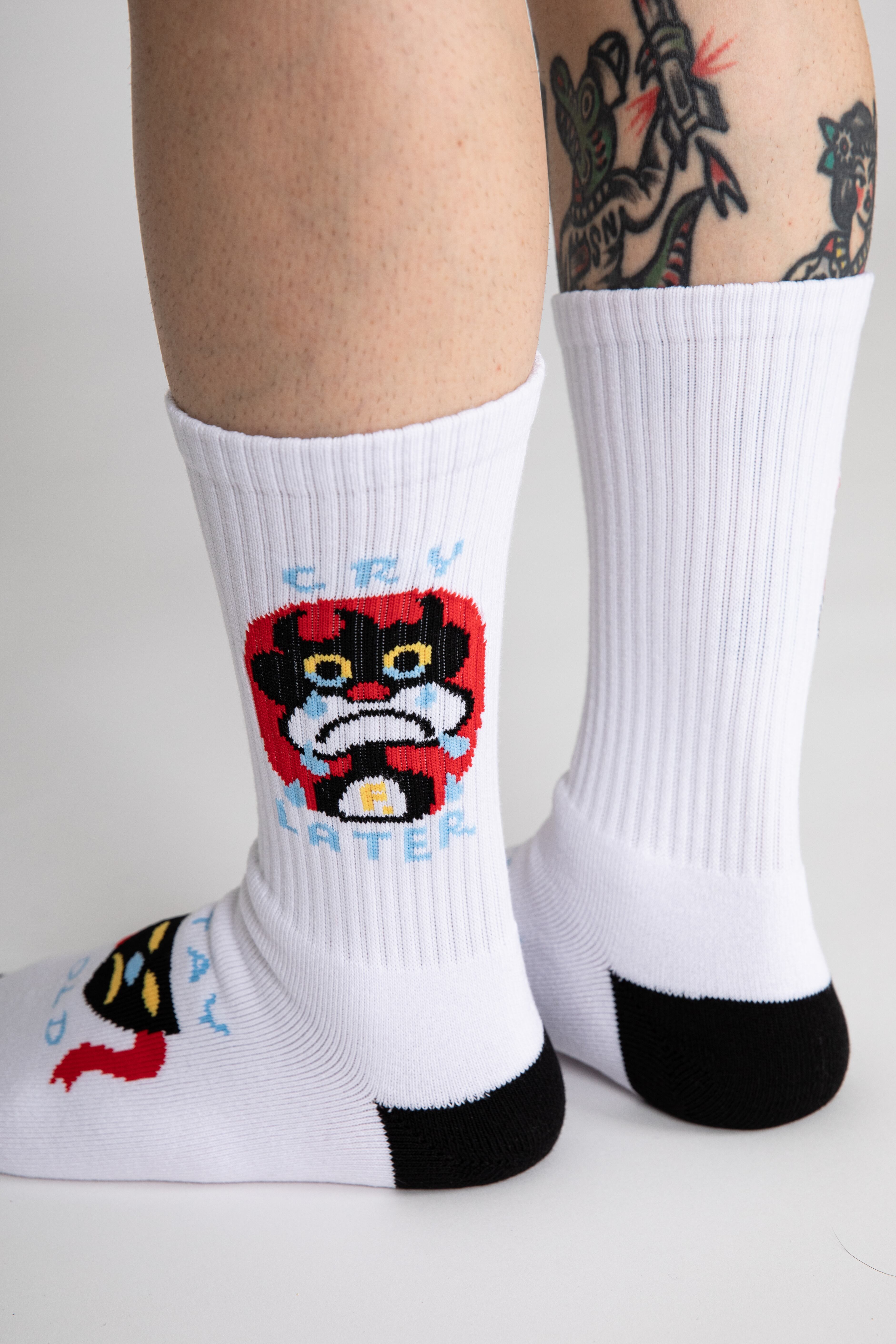 短すぎず長すぎないちょうど良い長さの靴下に彼のアートを詰め込みました。
