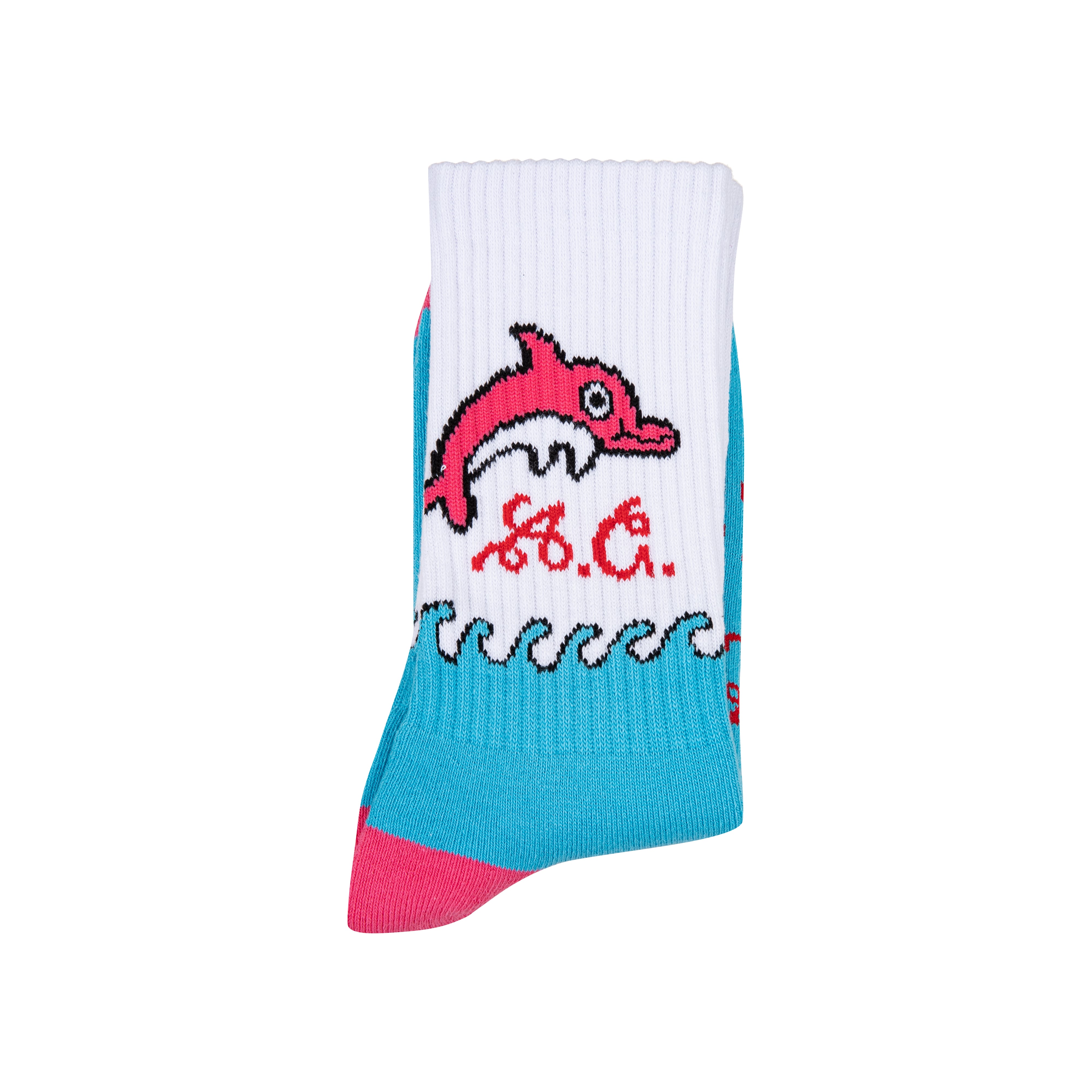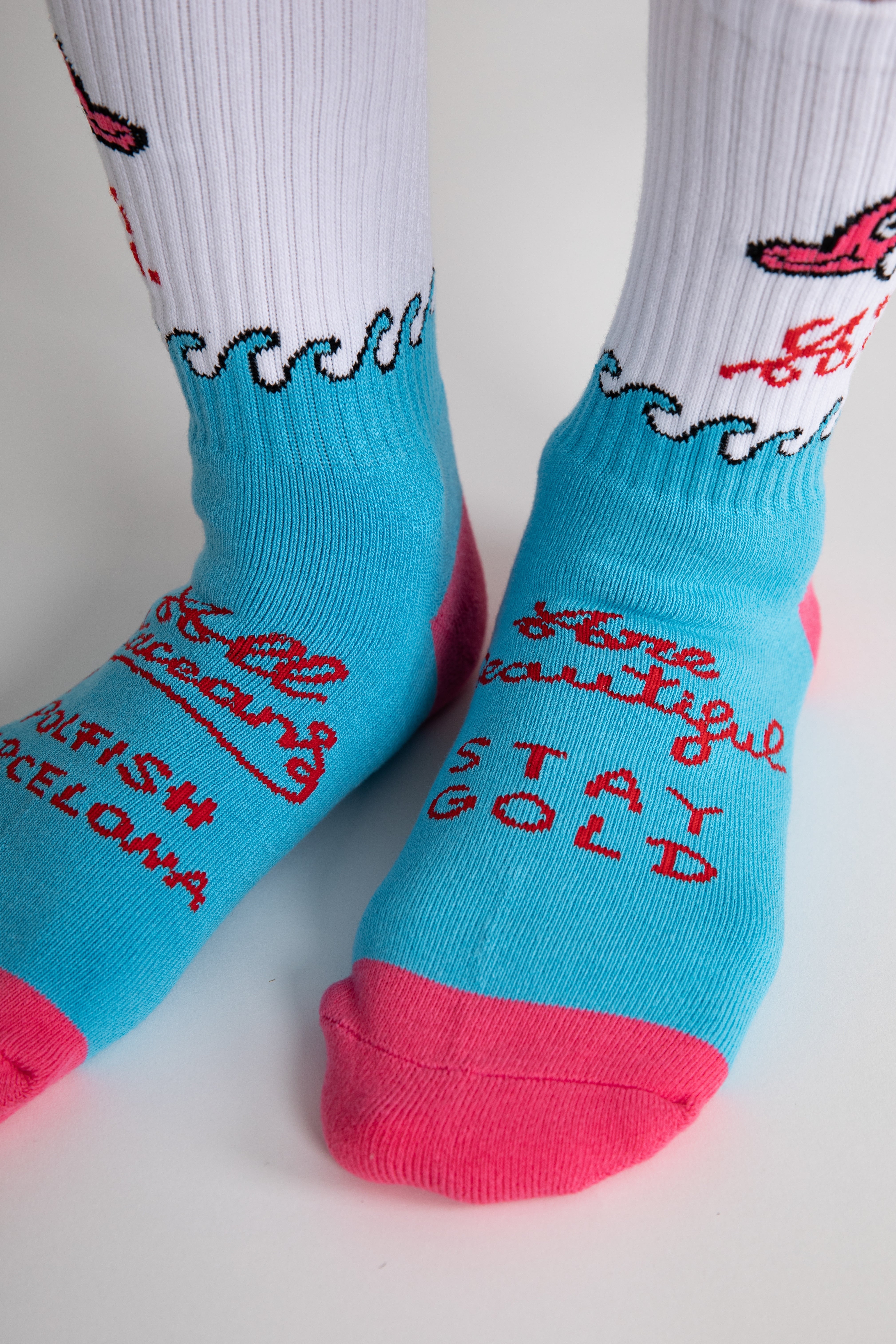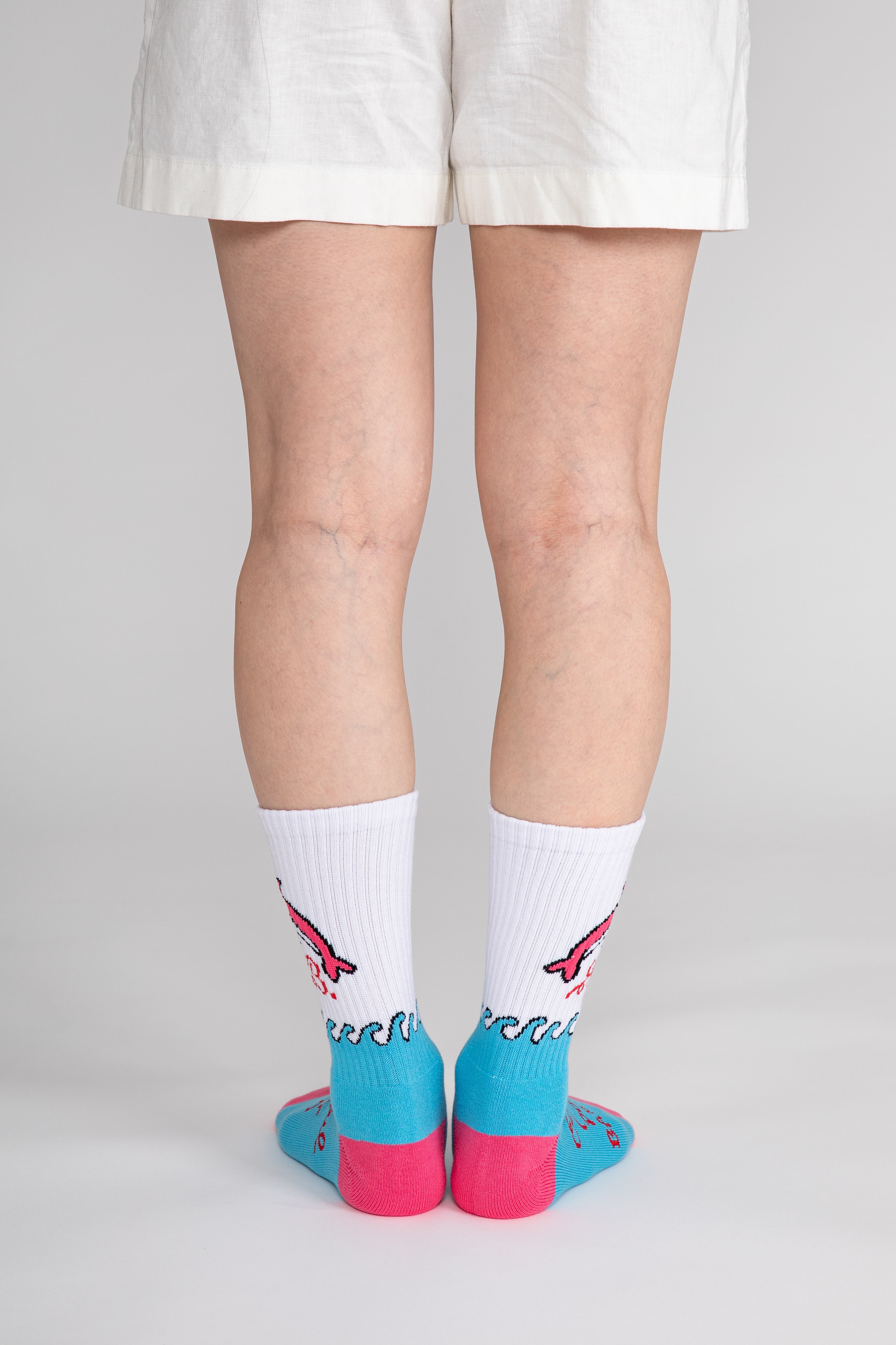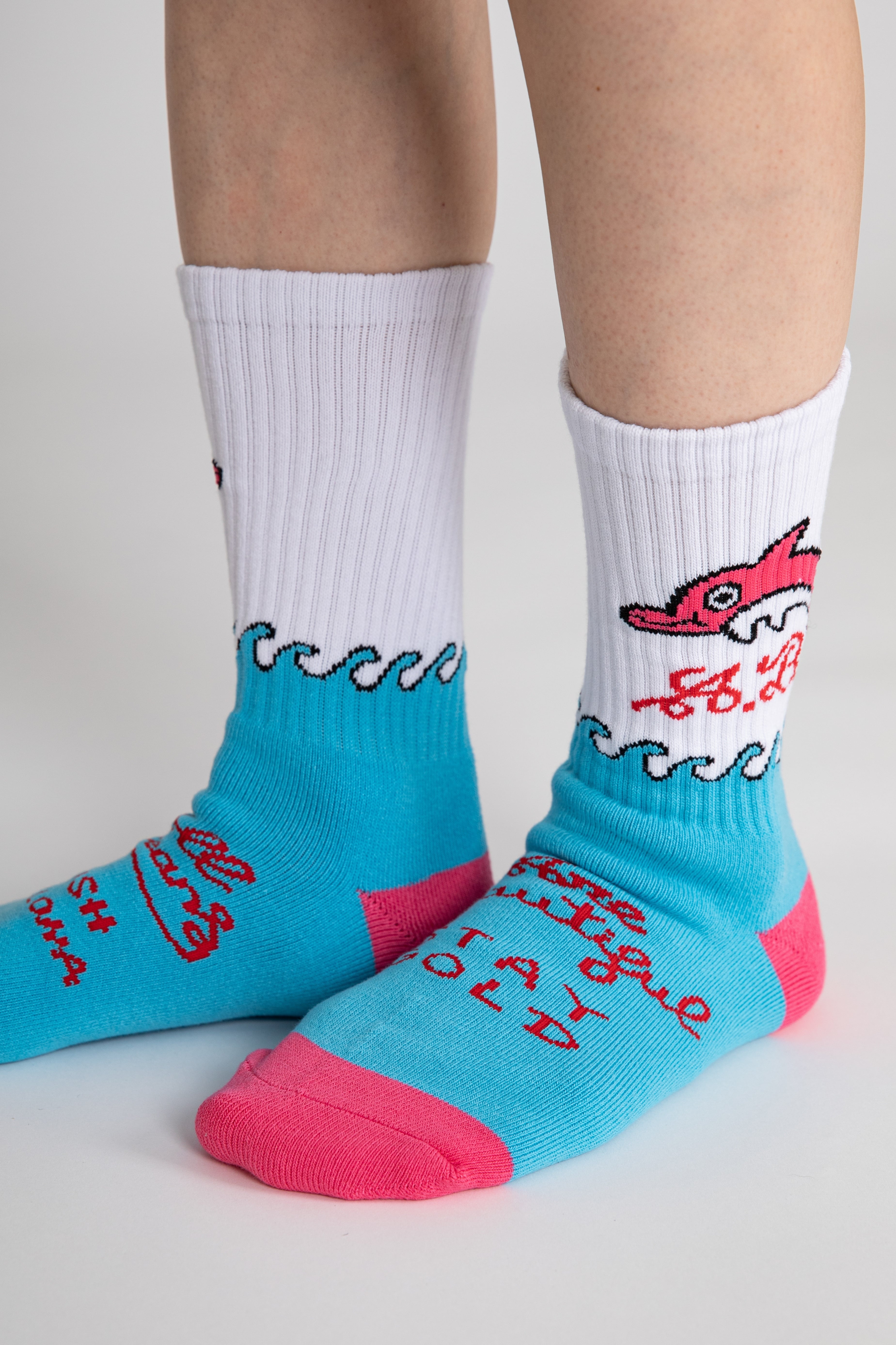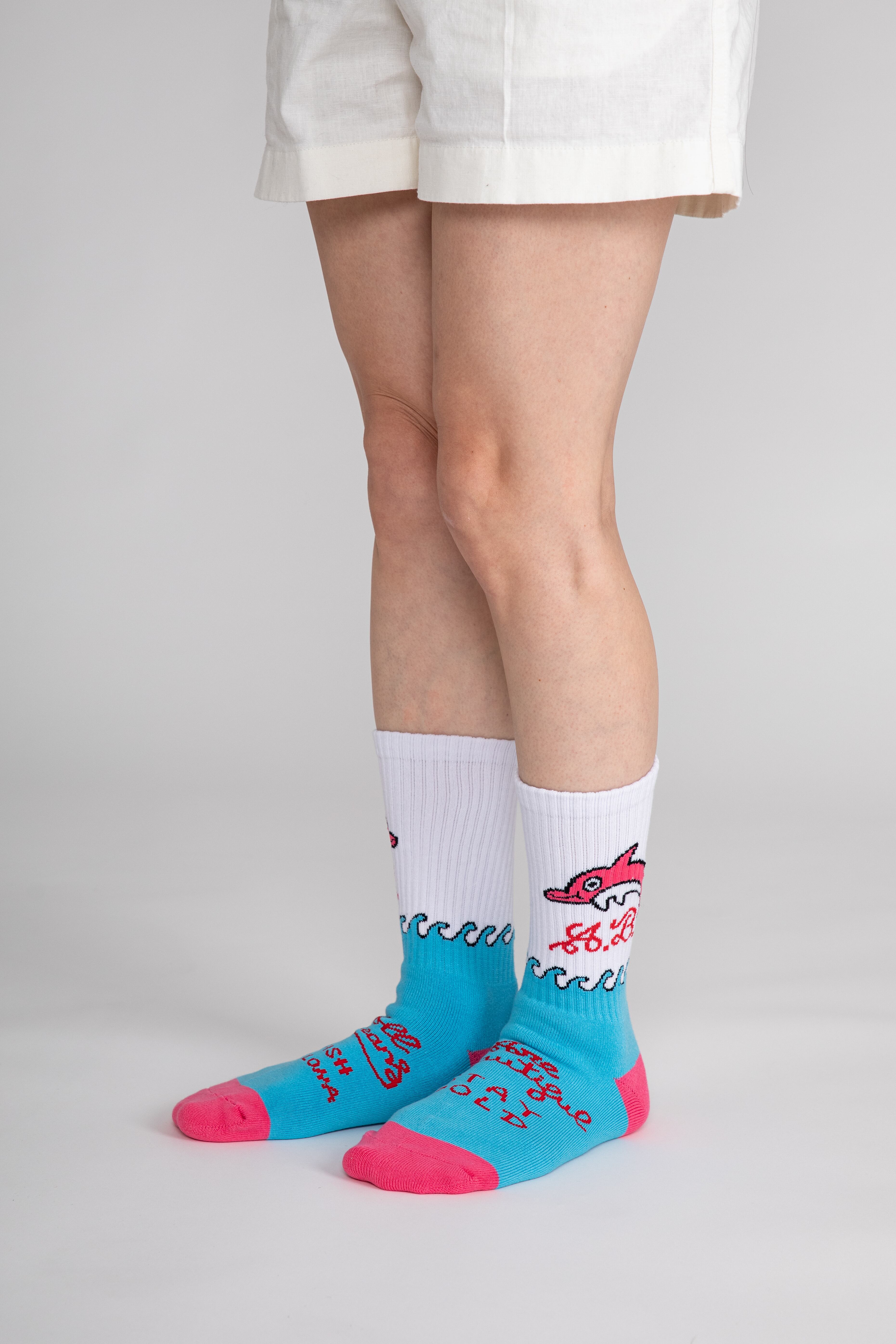 短すぎず長すぎないちょうど良い長さの靴下に彼のアートを詰め込みました。
