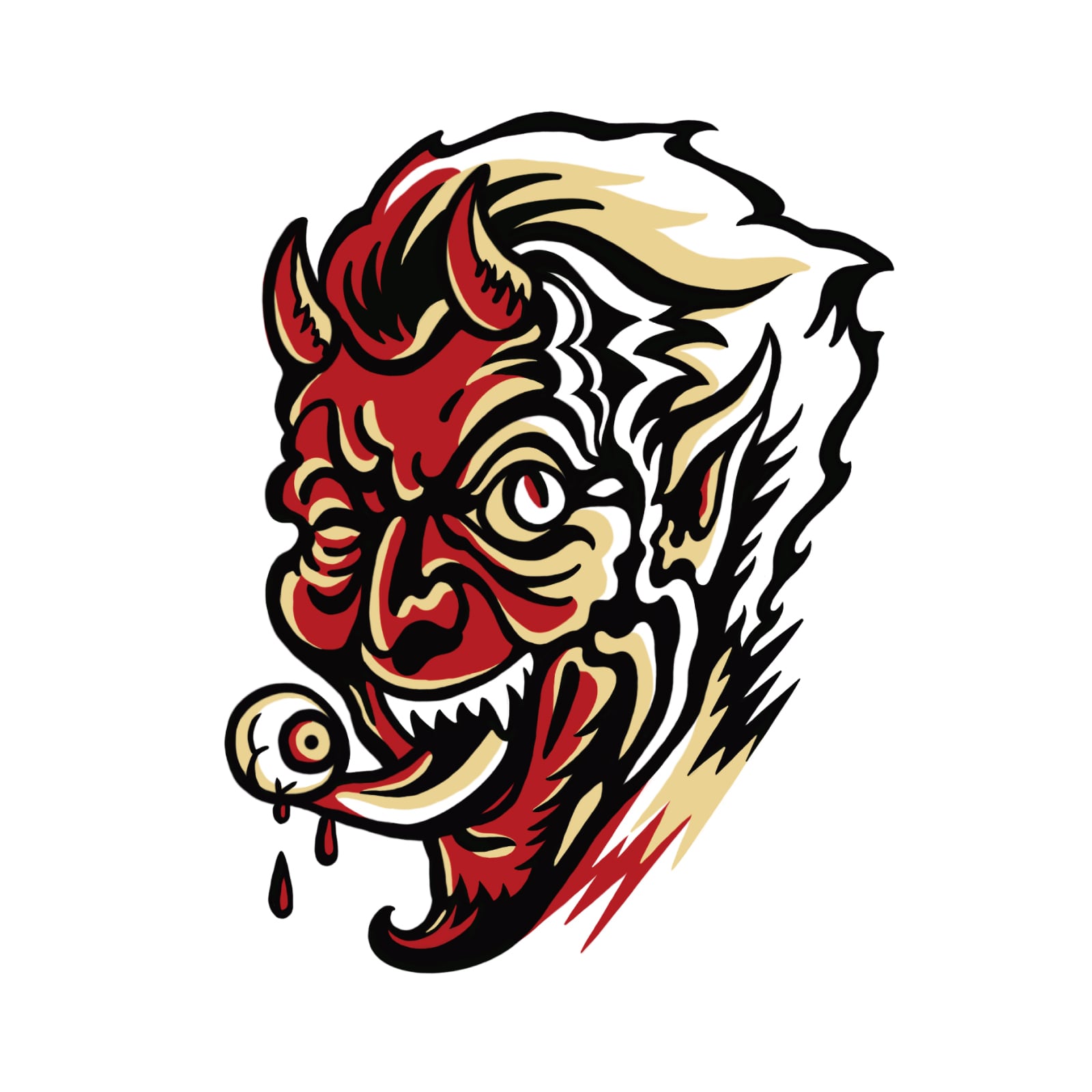 真っ赤な顔のデーモンで、舌の上には目玉が乗っています。
