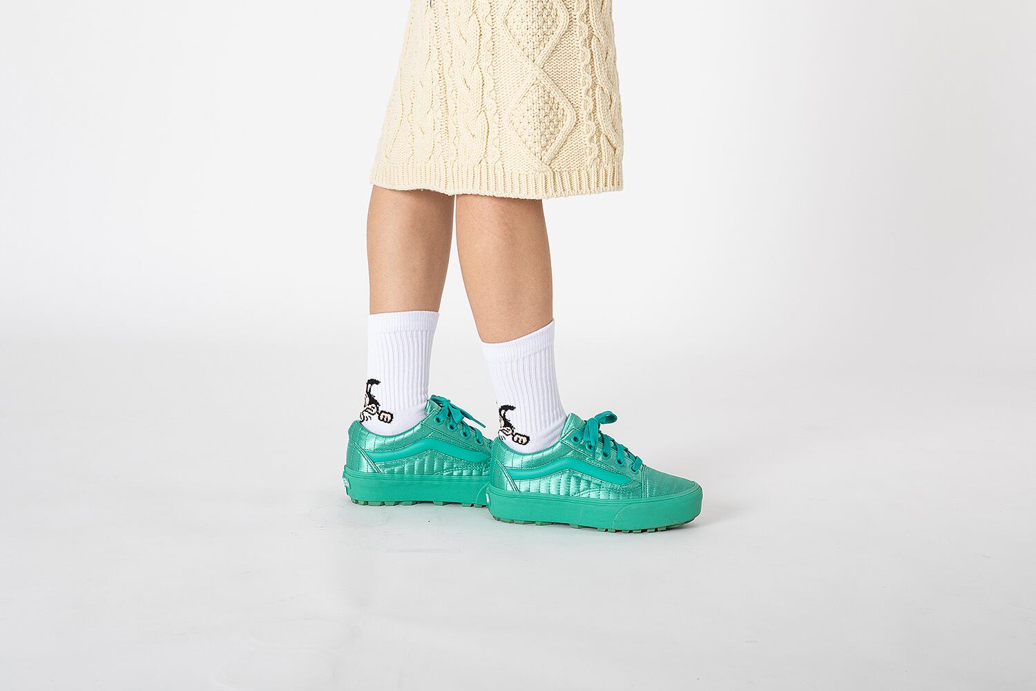 スニーカーを履いた時にちょうどカカトの上に顔を出します。